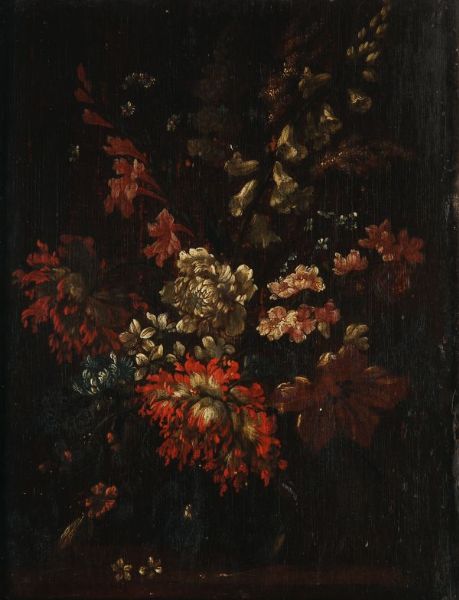 Chrysanthemums, tulips, forget-me-nots and other flowers in a vase
