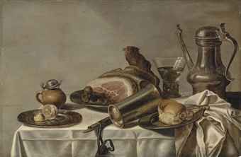 | A ham on a pewter platter, a pealed lemon and a roll on pewter platters, a tankard, a roemer and a goblet, on a partly-draped ta | |