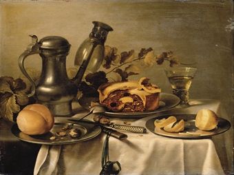 | An overturned roemer on a pewter ewer, a pie, a bread roll and a partly-peeled lemon on pewter plates, a roemer, knives, walnuts | |