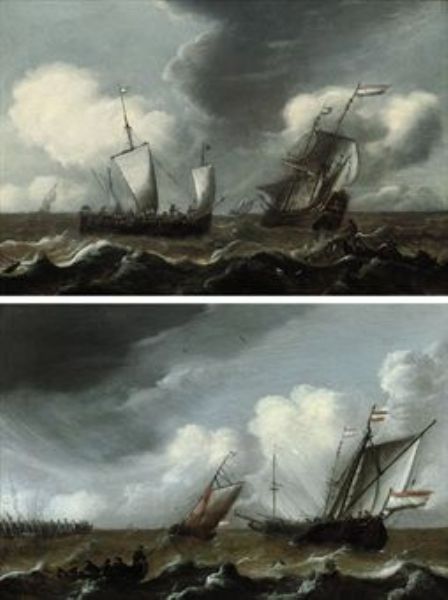 | A Dutch schooner, a man-o'-war, and a fishing boat in stormy seas; and Dutch schooners and a landing skiff approaching the harbo | |