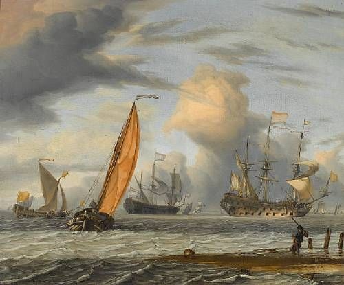 Dutch vessels in choppy seas, a fisherman on the shore in the foreground