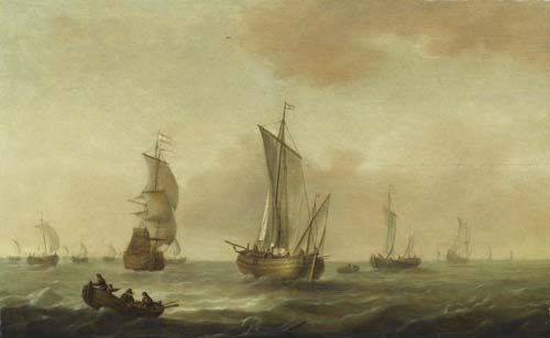 Fishermen in rowing boat before numerous sailing ships