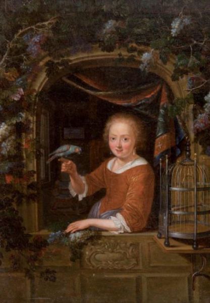 Jeune fille à la fenêtre, tenant un perroquet