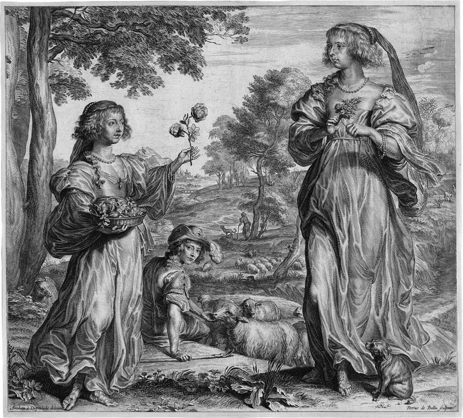 Edeldame und junges Mädchen mit Blumen, im Hintergrund ein Schäferjunge