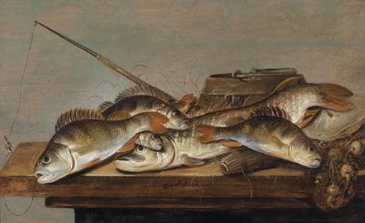 | Still life with fish, a fishing pole, and a net on a rough table top | |