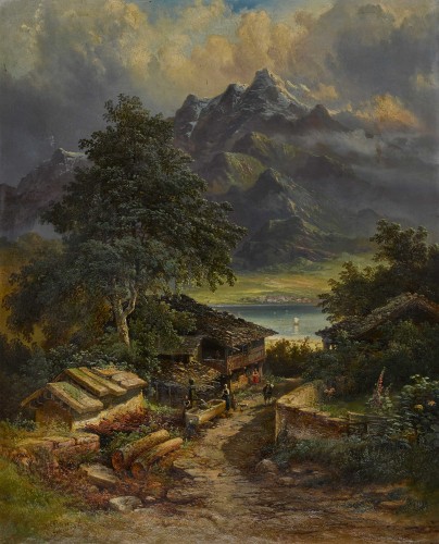 Berg- und Seelandschaft mit Bauernhaus und Staffage.
