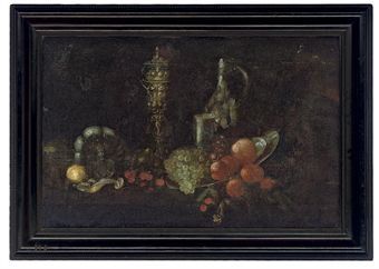 | Peaches and grapes on a silver plate, an ewer, a parcel-gilt covered cup, and a peeled lemon before a tipped tazza, and cherries | |