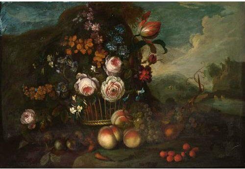 | A STILL LIFE WITH ROSES, A TULIP AND OTHER FLOWERS IN A BASKET, PEACHES, GRAPES AND STRAWBERRIES IN FRONT, IN A LANDSCAPE | |