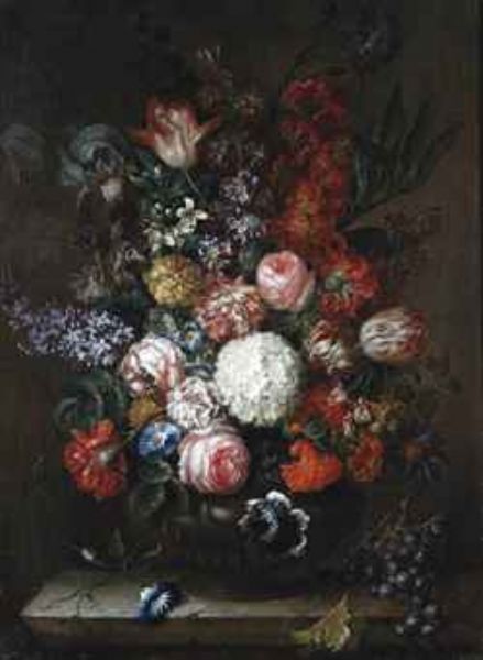 | Roses, carnations, honeysuckle, wisteria and other flowers with blue grapes, all on a stone ledge | |