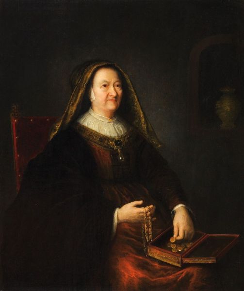 | Portrait of an old woman seated on a red chair counting coins | |