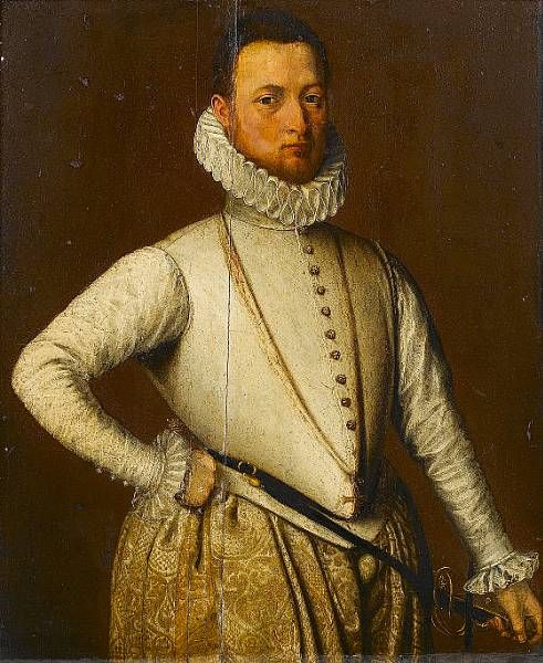 | Portrait of a gentleman, standing, three-quarter-length, in a white doublet and gold brocade hose | |