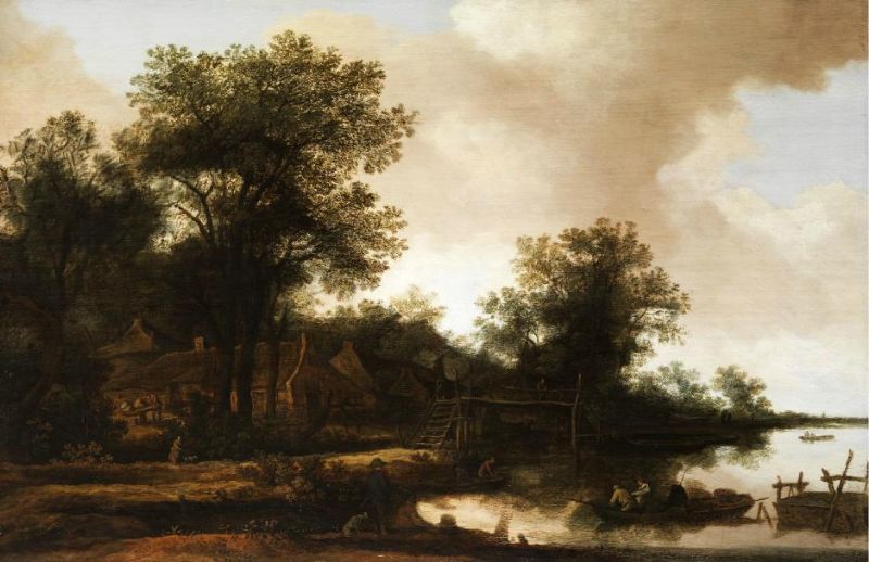 LANDSCHAFT MIT TEICHUFER UND BAUERNHÄUSERN UNTER HOHEN BÄUMEN