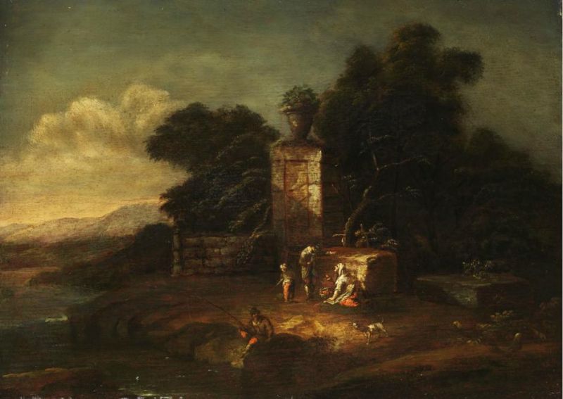 | ABENDLICHE LANDSCHAFT MIT FIGURENSTAFFAGE VOR ANTIKEM STEINMONUMENT MIT STEINVASE | |