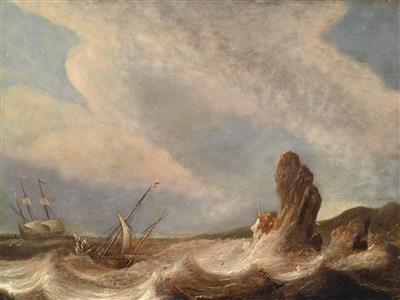 Ships in a tempest off a rocky coast