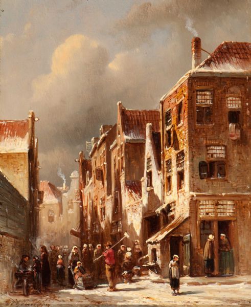 | Bedrijvigheid in een besneeuwd dorpsstraatje | |