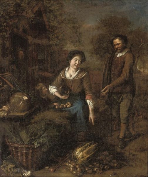 | A wooded landscape with a woman selling fruit and vegetables to a gentleman | |