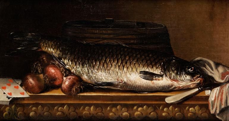 STILLEBEN MIT KARPFEN, ZWIEBELN, SPIELKARTEN UND MESSER