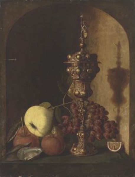 | Grapes, a pear, an apple, a lemon, oysters and a silver-gilt cup in a stone niche | |