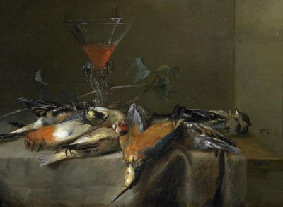 Niederlanden Stillleben mit Vögeln und einem Glas Wein