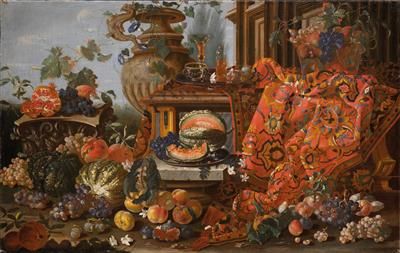 | Still life with fruit, a Corinthian capital, a decorated vase and a carpet in an open garden | |