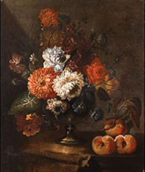 STILLLEBEN MIT BLUMENVASE UND OBST
