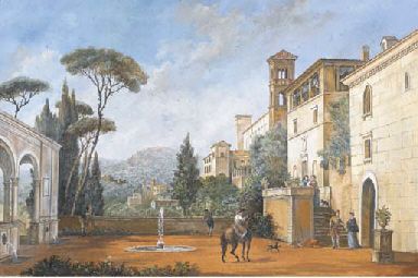 | Cour intérieure d'une villa italienne avec personnages, dont un cavalier | |