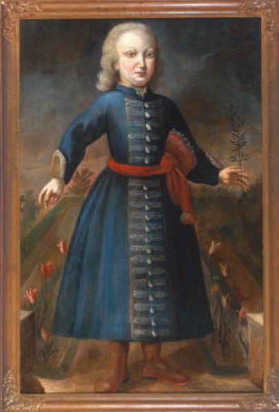 Ganzfiguriges Portrait eines Kindes im blauen Rock vor Gartenhintergrund