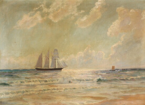 Coastal scene with sailing ship and sail boat