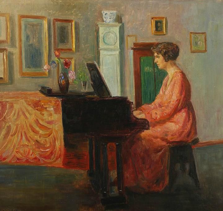 Interior with a woman by a piano