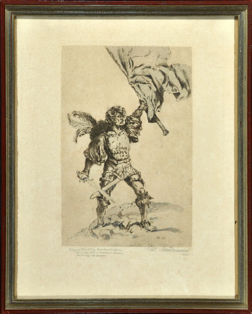 Landsknechtshauptmann Georg von Frundsberg mit Schwert und Fahne