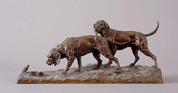 | Chiens de chasse et poussin posé sur le bord de la mangeoire | |
