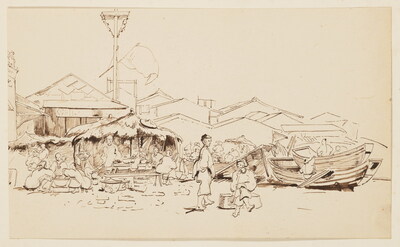 | Quatre scènes de la vie quotidienne chinoise : deux scènes de repas et deux études de personnages aux abords d'un temple | |