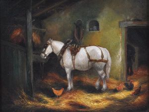 Horses, chicks and ducks in a stable