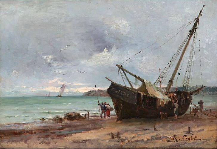 A tucked fishing boat on a beach, presumably in Brittany.