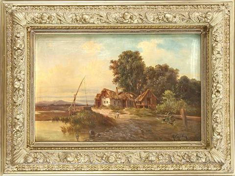 osteuropäische Landschaft mit Brunnen, Bauernhaus und Staffagefigur,