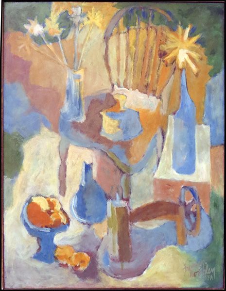 STILL LIFE WITH CHAIR, FLOWERS, AND FRUIT.