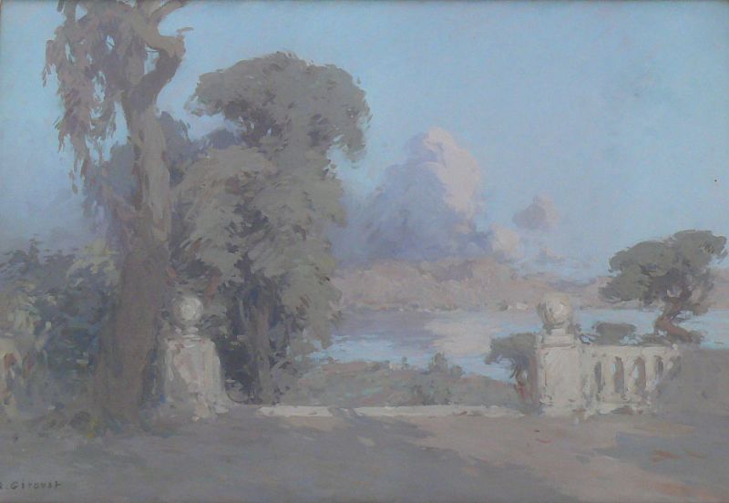 ''Italienische Landschaft''; Blick von einem Park auf See u. gegenüberliegendes, hügeliges Ufer