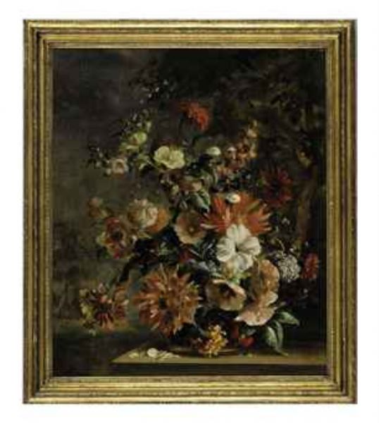 | Still life of an arrangement of flowers in a vase in a wooded landscape | |