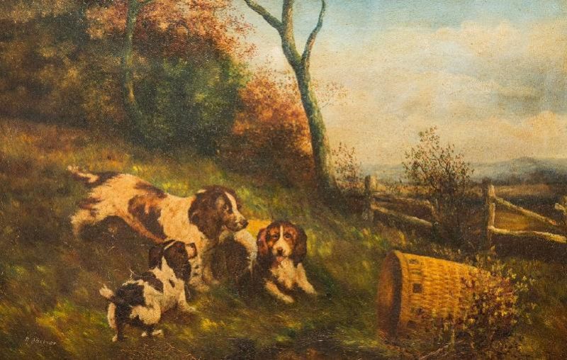 SPANIEL WITH HER YOUNG PUPPIES IN A LANDSCAPE