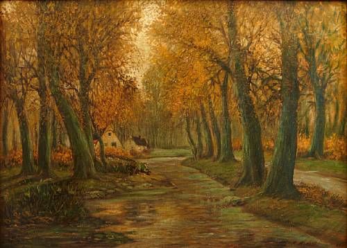 An autumn landscape with cottages along a river