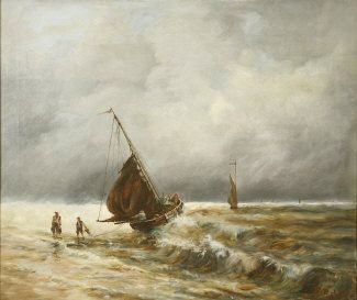 Fisherfolk on a Beach and Fishing Boats in Choppy Water