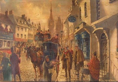 Busy London street scene, with Sherlock Holmes and Dr Watson