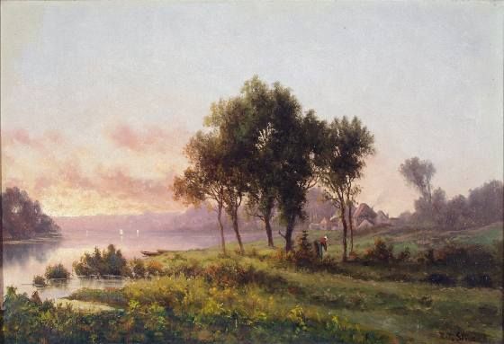 Flusslandschaft mit Gehöft und Frau im Morgenrot