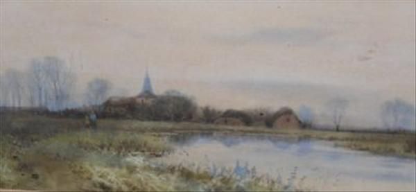 Figures before a village spire with lake