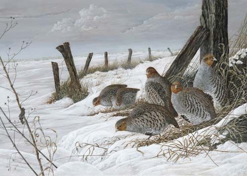 Rebhühner in weiter schneebedeckter Landschaft, Deckfarben