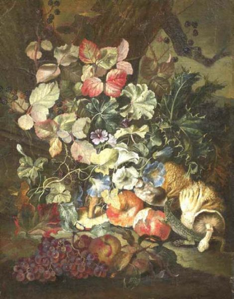 NATURA MORTA CON FIORI, FUNGHI, UVA E MORE