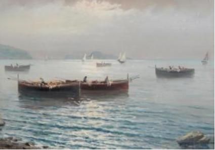 Barche di pescatori al tramonto sullo sfondo di Procida