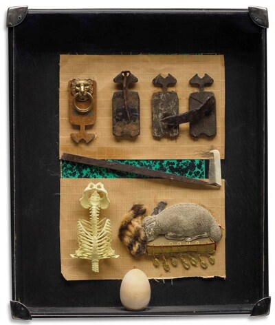assemblage de clou, point taillée en fer, peigne, squelette en plastique, fausse fourrure, broderie, œuf en bois, mine de plomb, papier kraft, petit heurtoir, cosse et éléments mét | |