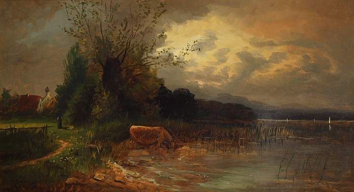 Weite faszinierende Chiemseelandschaft mit Segelschiffen, kleines Dorf mit Kirche unter bewölktem Himmel