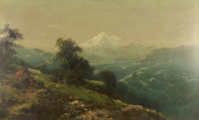 ''Indian Encampment'', figures on a hillside overlooking a valley